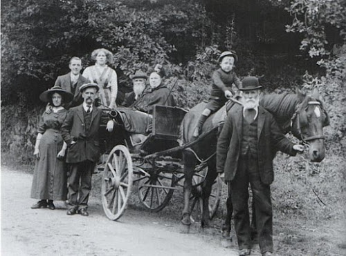 I wrote last week about the photographs of Tom Mathias, taken in the early 20th century. One of them, not included in that post, has a special significance for me. It shows a party outing in 1910. At the back of the carriage is a young man, Morgan Mathias. There are plenty of other people in the photograph whose characters shine through their bulk and their bushy beards.