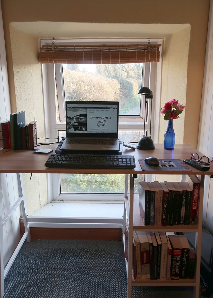 Every now and then, one of our Crime Cymru authors is brave enough to offer us a glimpse of the place where they write. This week, Thorne Moore shows off the tidiest desk any of us has ever seen, and reveals the beautiful spot where the writing really happens.