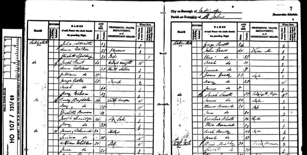 I had a great great grandmother, Mary Jane Burnand, born in 1840, whom I tracked down by registered births and marriages, to a census return of 1841. The infant Mary Jane was living with her parents Thomas and Jane Burnand and her maternal grandmother Sarah Lovett, at 13 Perkins Rents, in the parish of St John’s, Westminster. Thomas was a labourer. Grandmother Sarah was a lodging house keeper. I could make certain deductions from this, but what really paints the picture in glorious technicolour, is the history of the area. This was one case where I didn’t have to apply too much imagination of my own because someone had been there before me.