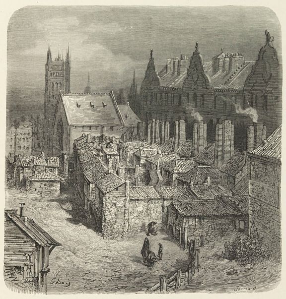 There is no district in London more filthy and disgusting, more seeped in villany and guilt, than that on which every morning’s sun casts the sombre shadows of the Abbey, mingled, as they soon will be, with those of the gorgeous towers of the new Palace at Westminster. The Devil’s Acre , as it is familiarly known in the neighbourhood, is the square block comprised between Dean, Peter, and Tothill Streets, and Strutton Ground. It is permeated by Orchard Street, St. Anne’s Street, Old and New Pye Streets, Pear Street, Perkins’ Rents, and Duck Lane. From some of these, narrow covered passage-ways lead into small quadrangular courts, containing but a few crazy, tumbledown-looking houses, and inhabited by characters of the most equivocal description. The district, which is small in area, is one of the most populous in London, almost every house being crowded with numerous families, and multitudes of lodgers. There are other parts of the town as filthy, dingy, and forbidding in appearance as this, but these are generally the haunts more of poverty than crime. But there are none in which guilt of all kinds and degrees converges in such volume as on this, the moral plague-spot not only of the metropolis, but also of the kingdom.”
