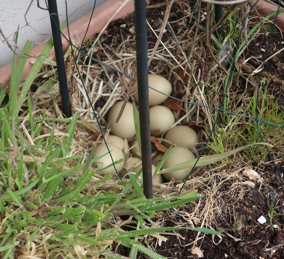 I am not sure how much comes naturally to a lady pheasant who was hatched in an incubator. Some of the females have not entirely mastered the essentials. One of the Front Garden ladies decide to lay a clutch of 13 eggs in my sweet pea planter, and though I carefully avoided touching it, she forgot all about them. After two months I gave in and distributed them along the lane. I wanted my planter back.