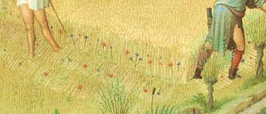 Many years ago, I couldn’t resist making an applique embroidery copy (a very loose copy) of one of the pictures, July, with cornfields being harvested, sheep being sheared and swans gliding by the château of Poitiers.